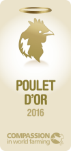 Trois sociétés, dont une société familiale alsacienne, ont reçu un "Poulet d'or". La catégorie "Poulet d'or" récompense les distributeurs ou élevages qui utilisent (ou qui s'y engagent) du poulet issu d'élevages répondant à certaines conditions de bien-être animal - relatives à la densité d'élevage, au rythme de croissance et à l'enrichissement du milieu.